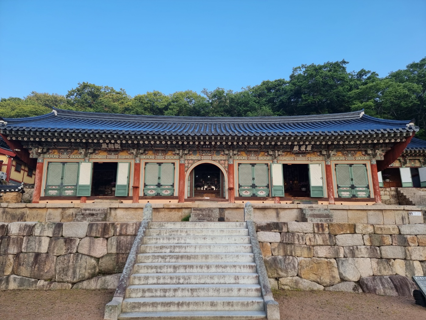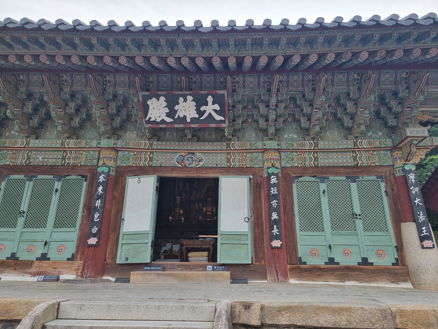 대웅전(大雄殿)은 큰 영웅 즉, 석가모니(釋迦牟尼), 제화갈라(提和竭羅菩薩), 미륵보살(彌勒菩薩)을 모신 전각인데, 보물로 지정되어 있고, 안에 있는 불, 보살상 역시 '목조 석가여래삼존좌상(木造 釋迦如來 三尊坐像)'으로 보물로 지정되어
